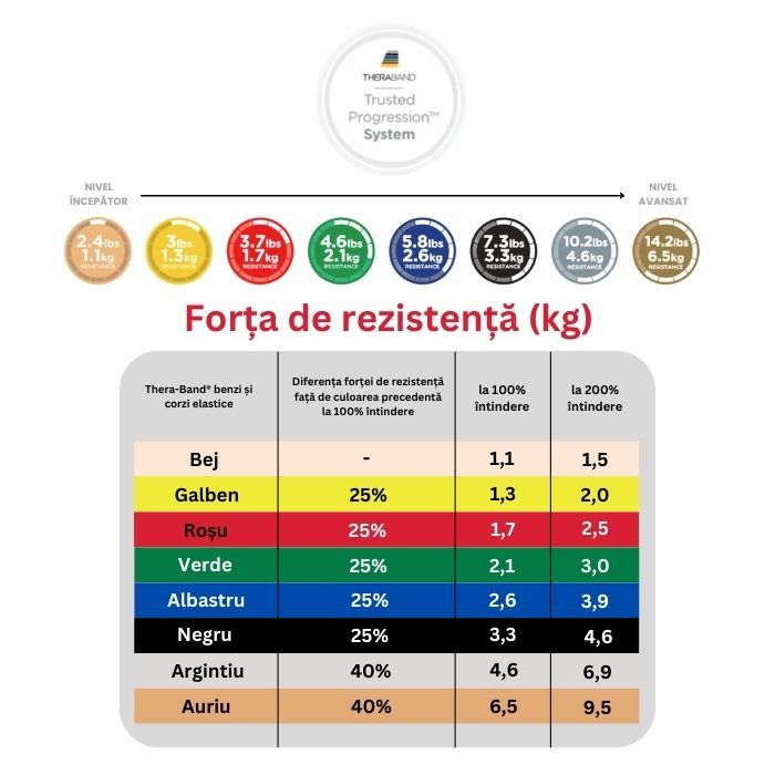 Benzile elastice profesionale TheraBand ajută utilizatorii în reabilitarea accidentărilor, îmbunătăţirea vitalităţii şi sporirea performanţelor atletice. Binecunoscuta scală de culori TheraBand arată gradul de rezistenţă în condiţiile avansării în diferitele nivele de dificultate, în funcţie de performanţa individuală.